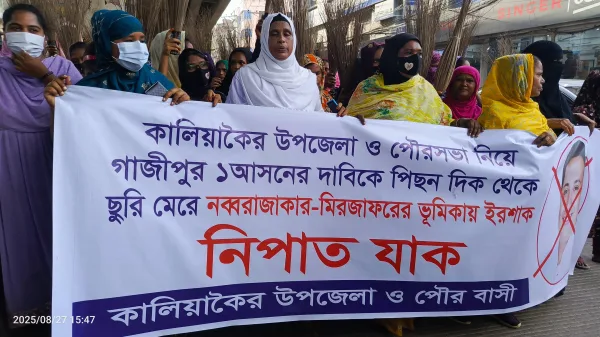 গাজীপুরের কালিয়াকৈর উপজেলার সফিপুর এলাকায় বুধবার (২৭ আগস্ট) বিকেলে এক জোরদার ঝাড়ু মিছিল অনুষ্ঠিত হয়েছে। মিছিলটি গাজীপুর-১ আসনের দাবিকে উপেক্ষা করার প্রতিবাদ হিসেবে অনুষ্ঠিত হয়। মিছিলে শতাধিক নারী অংশ নেন